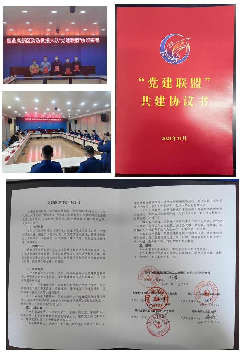 此次活动由高新区(高港区)消防救援大队举办,滨江园区共同受邀的党支部还有泰州市医药高新区滨江工业园区专职消防队党支部、中海油气(泰州)石化有限公司HSE党支部、扬子江药业集团海慈党支部、泰州海泰油品党支部。活动旨在通过与各党支部组建党建联盟的方式,进一步提升各基层党组织高质量运行,扎实推进党务业务服务深度融合。通过不断健全完善党建联盟组织设置、运行管理、作用发挥、工作保障等机制建设,进一步整合资源力量,强化工作联动机制,以党建工作一体化,形成激活效应、集聚效应、互补效应,推进党建与中心工作、职能业务全面渗透、高度融合;以党建为引领,强化统筹协调,拓展服务功能,丰富活动载体,有效激发联盟成员单位党组织生机活力,取长补短,资源共享,创建党建工作新格局。